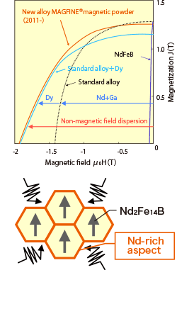 Up to this point, precious rare earth elements Dy and Ga were added in order to give the material heat resistance. We successfully created low-cost magnets by diffusing a non-magnetic powder into the grain boundary of the d-HDDR powder with a particulate size of 0.3 micrometers that gave the product a heat resistance of 150℃.