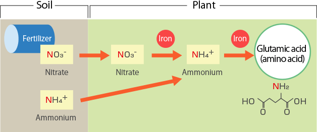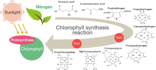 Vegetation carries out photosynthesis to create energy, and this function is performed by chlorophyll. When making chlorophyll from nitrogen compounds, iron is needed. Without iron, chlorophyll cannot be produced and the plant will be unable to photosynthesize. Soil with high pH or in a poor environment such as low warmth or low light, iron absorption suffers and the color of the leaves will become lighter. In these circumstances, providing easy-to-absorb iron restores the health of the plant.