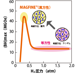 NdFeB合金と水素との吸脫反応の速度をある臨界速度に制御すると結(jié)晶粒の微細(xì)化と異方化が同時(shí)に実現(xiàn)され、すぐれた磁粉を得ることができます。