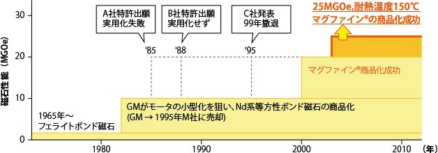 NdFeB系異方性ボンド磁石マグファイン?(略記MF)は、世界最高の25MGOeの磁力と150℃の耐熱性を有する優(yōu)れたボンド磁石です。1982年に発明された世界最強(qiáng)のNdFeB系磁石は、焼結(jié)磁石及び等方性ボンド磁石として生産されています。等方性ボンド磁石は、磁石性能が劣るため、性能の優(yōu)れた異方性磁粉の開発が20年來望まれていました。當(dāng)社は、異方性磁粉の製造原理(d-HDDR法)を発見し、異方性ボンド磁石の商品化に成功しました。