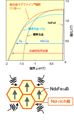 これまでは、耐熱性を持たせるため、Dy、Gaといった高価な希土類元素が添加されていました。弊社では、粒徑0.3μmのd-HDDR粉に対して、非磁性粒界拡散を行うことにより、Dy、Gaを使用することなく150℃の耐熱性を持たせた低コストの磁石を作り出すことに成功しました。