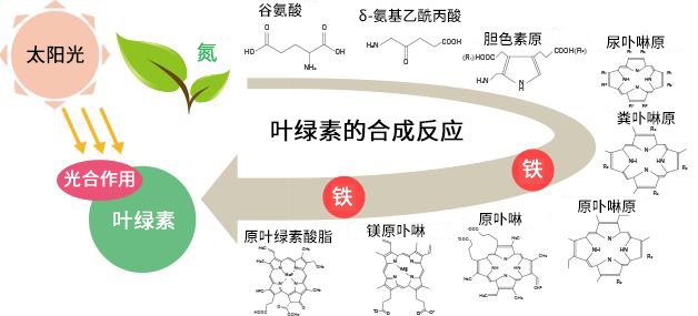 植物進(jìn)行光合作用,生產(chǎn)能量,依靠了葉綠素的作用。而氮素生產(chǎn)成葉綠素過(guò)程中,鐵是必須不可缺的。沒有鐵,就不能生成葉綠素,光合作用也就不能進(jìn)行。PH值高的土壤,溫度低,光照低等不良環(huán)境中,吸收鐵的能力就變?nèi)酰~片顏色也變淡。這種情況下提供易于吸收的鐵,植物就能重新煥發(fā)生機(jī)。